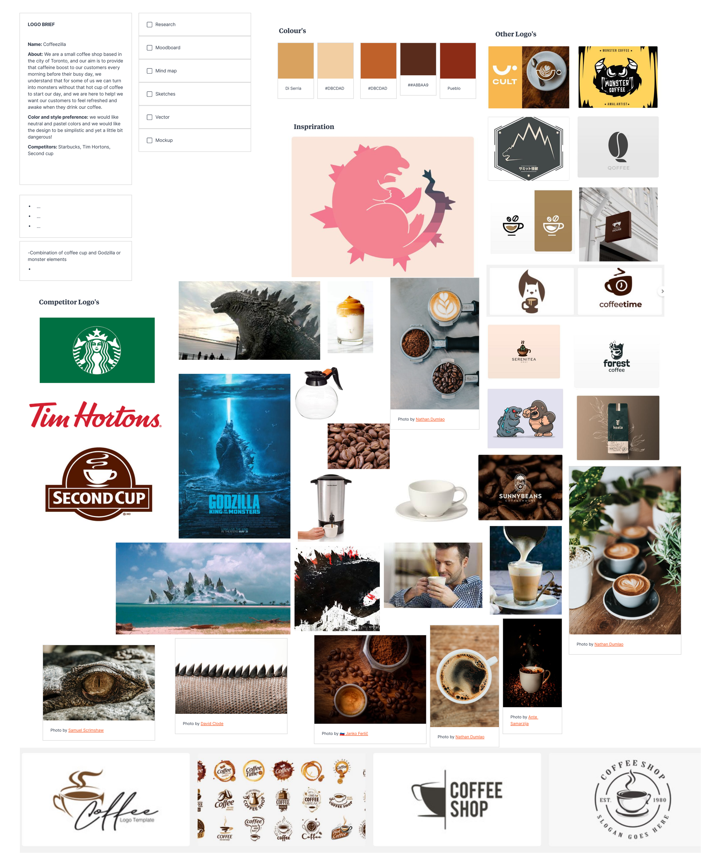 The first thing I did when taking on the challenge of creating this logo and branding was; make a mood board. I did some research into competitor brands and coffee shops as well as finding images I could gather inspiration from such as images of Godzilla, monsters or just images of coffee.